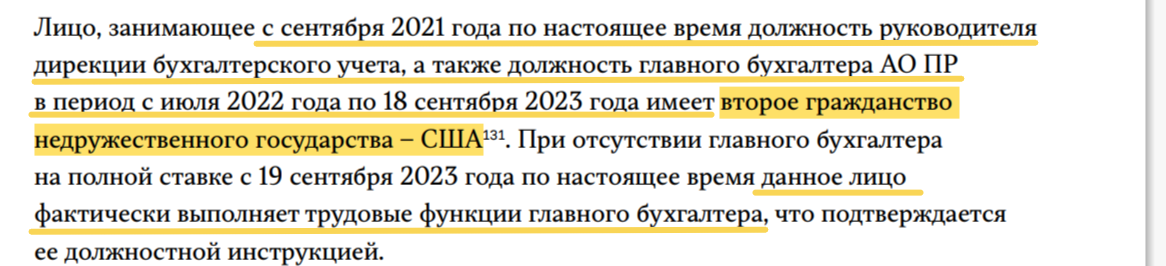 Проверка Счетной палаты вскрыла вовсе невероятные кадровые решения в компании. Выяснилось, что на момент аудита в "ПР" не было полноценного главного бухгалтера – его обязанности исполнял один из заместителей гендиректора, оформленный всего на 0,1 ставки  – то есть, по сути, на несколько часов в день. Но и это не всё. Согласно данным редакции, сотрудница, которая эту ответственную работу выполняла, является гражданкой США.