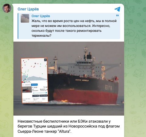 Кроме того, ряд источников сообщает, что неизвестные беспилотники или БЭКи атаковали у берегов Турции шедший из Новороссийска под флагом Сьерра-Леоне танкер Altura. На борту танкера было 140 тыс. тонн нефти. Турецкие СМИ пишут, что в результате ударов на судне произошел мощный взрыв, и экипаж сразу запросил помощи. Уточнялось, что сообщений о масштабном разливе нефти пока не было, основной удар пришёлся на капитанский мостик и технические отсеки, что привело к потере хода и частичному затоплению машинного отделения.