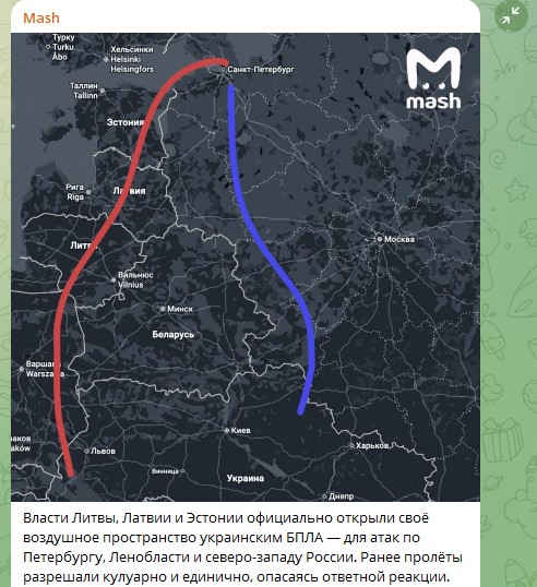 Так же тревожно на фоне происходящего выглядит сообщение Mash, который уверяет в том, что власти Литвы, Латвии и Эстонии якобы официально открыли своё воздушное пространство украинским БПЛА для атак по Петербургу, Ленобласти и северо-западу России. Ранее пролёты разрешали кулуарно и единично, опасаясь ответной реакции. По данным источника, для атак на Санкт-Петербург ВСУ используют установки в Черниговской области. Для атаки на область украинским дронам приходилось преодолевать 850 км по воздуху и пролёт над Брянской, Смоленской, Тверской, Новгородской и Ленинградской областями, что крайне затрудняло для них путь до самого Петербурга. Однако теперь, по словам авторов канала, альтернативный маршрут, который для ВСУ открыли страны Прибалтики, включает в себя облёт Белоруссии через Польшу, Латвию, Литву, Эстонию и акваторию Балтийского моря, и это даёт открытый выход в Финский залив и обход систем ПВО в регионах. Официально данная информация ещё не подтверждалась ни одной стороной. В том числе Россией.