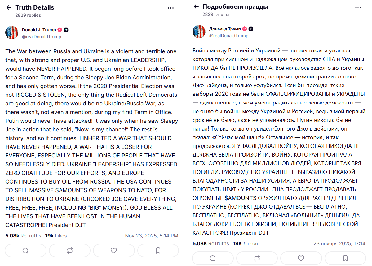 23 ноября в своей социальной сети Truth Social Дональд Трамп опубликовал разгромное сообщение, в котором обвинил "руководство" Украины в полном отсутствии благодарности за усилия США. Ключевое слово "руководство" было взято им в кавычки, что было воспринято как прямой намек на то, что Зеленский не является независимой фигурой и подчиняется внешним силам.