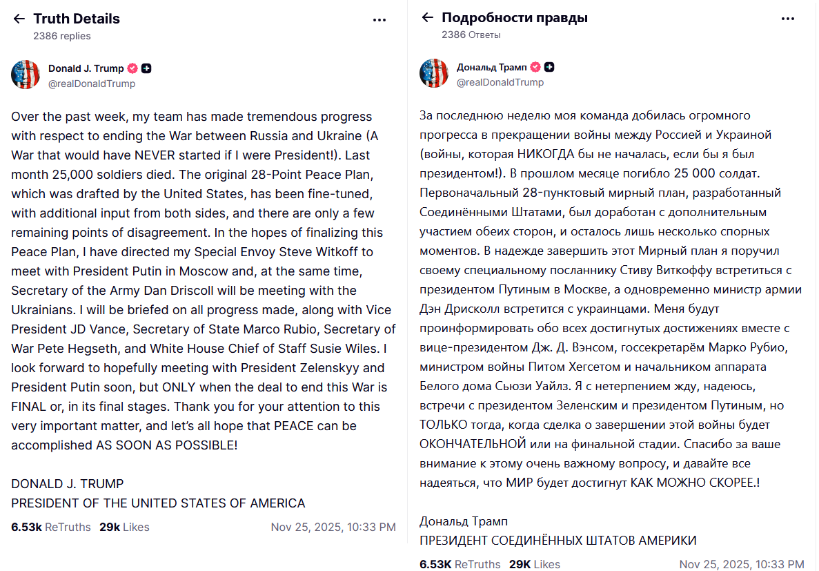 Попытки Киева и его европейских союзников смягчить условия провалились. 23 ноября в Женеве прошли переговоры, но практически сразу после них Трамп и опубликовал свое гневное послание в соцсети Truth Social, показав, что не намерен терпеть дальнейшие проволочки. Европейские "поправки", предполагавшие, в частности, завершение конфликта по текущей линии фронта, противоречили ключевому пункту США о выводе ВСУ из Донбасса.