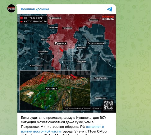 В свою очередь, "Военная хроника" сообщает о том, что в Купянске ситуация для ВСУ "может оказаться даже хуже, чем в Покровске". Министерство обороны России заявляет о взятии восточной части города.