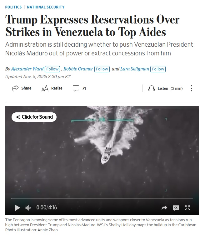 По данным WSJ, споры в Белом доме свидетельствуют о том, что "стратегия администрации в отношении Венесуэлы остаётся переменчивой, несмотря на наращивание вооружённых сил в регионе и публичные угрозы Трампа начать атаки". Источники издания утверждают, что в Вашингтоне отсутствует единое мнение даже о том, что делать с руководством Венесуэлы.