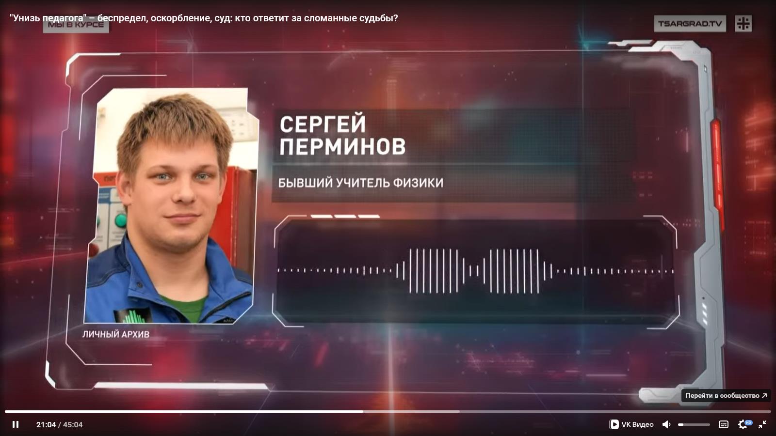 В итоге молодой педагог, который с энтузиазмом начал работать в школе (молодой мужчина-учитель в нынешней школе, и не трудовик или физрук, - да его надо в Красную книгу заносить…), человек с активной гражданской позицией, помогающий фронту, остался без работы. И это не всё: Перминова приговорили к штрафу в 120 тысяч рублей и к полутора годам исправительных работ. Запретив к тому же преподавательскую деятельность, к которой Сергей теперь, по собственному признанию, вряд ли вернётся.