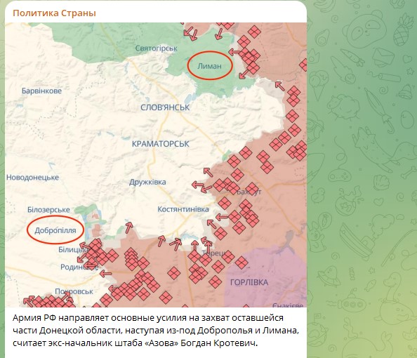 При этом украинский генерал также добавил, что действия идут не только со стороны Покровска, а но также продвижение есть на Краматорск и Славянск ещё и со стороны Северска и Лимана.