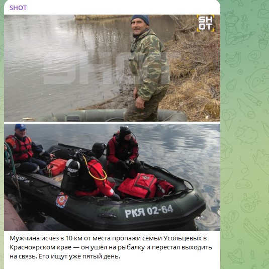 Тем временем, в 10 километрах от места исчезновения рыбака продолжают искать семью Усольцевых. Появляется всё больше версий их исчезновения - от трагичных и случайных до криминальных. При этом накануне пресс-секретарь Следственного комитета по Красноярскому краю и Хакасии Юлия Арбузова заявила о том, что семейство Усольцевых, которое бесследно исчезло в тайге Красноярского края, не собиралось покидать страну и не приобретало билетов на выезд.