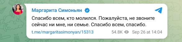 И они молились вместе с Маргаритой. Поэтому даже сейчас, в тяжёлый для себя час, Симоньян нашла в себе силы и обратилась к людям, которые много месяцев поддерживали её, чем могли - добрыми словами и обращениями к Господу, прося за её супруга.