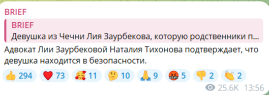 "Насколько мне известно, сейчас моя подзащитная Лия Заурбекова находится в безопасности и не в России. Другие подробности, в том числе места, пути, и прочие детали, мне неизвестны", — написала Тихонова.