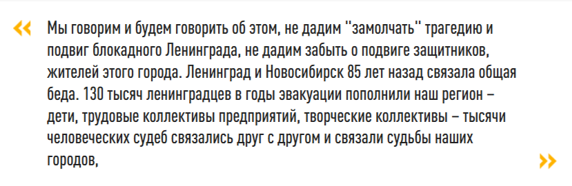 Губернатор Новосибирской области поблагодарил в своей речи ветеранов-блокадников, которые поддерживают связь между городами и поколениями. Он также передал им поздравление из Санкт-Петербурга от губернатора Александра Беглова.