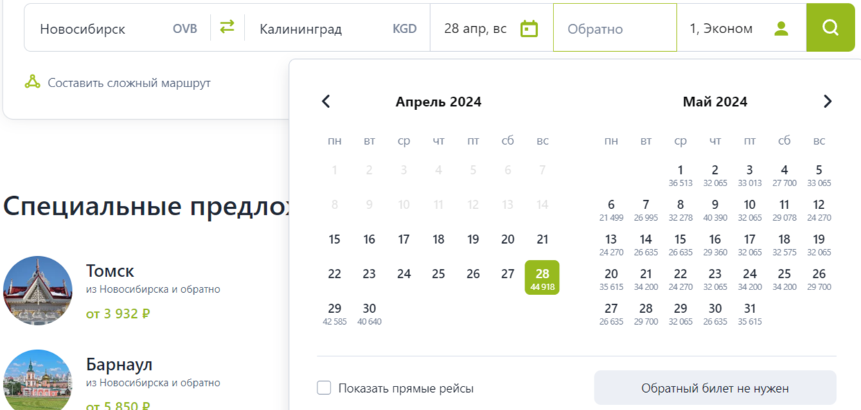 Стоимость билетов из Новосибирска в Калининград 28 апреля начинается от 31 000, вылететь обратно можно 5 мая за 19 000 рублей.