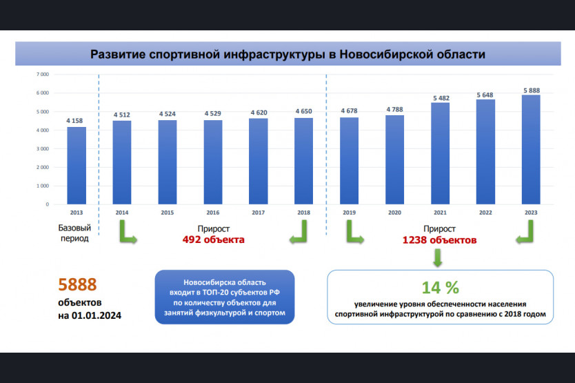К 2024 году удалось хорошую спортивную инфраструктуру для жителей региона. По сравнению с 2018 годом её уровень вырос почти на 15%. Это стало возможным благодаря открытию небольших объектов в шаговой доступности для людей. Региональный проект "Спорт – норма жизни позволил правительству Новосибирской области за пять последних лет оборудовать более 80 площадок для подготовки и сдачи нормативов ГТО.