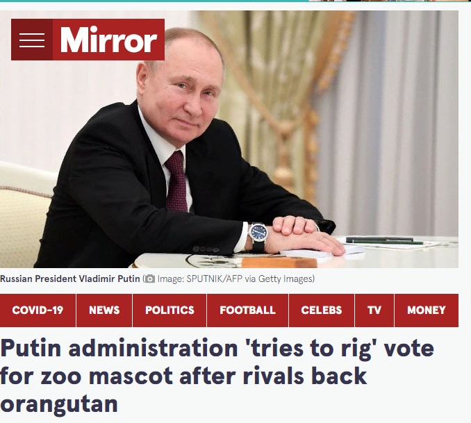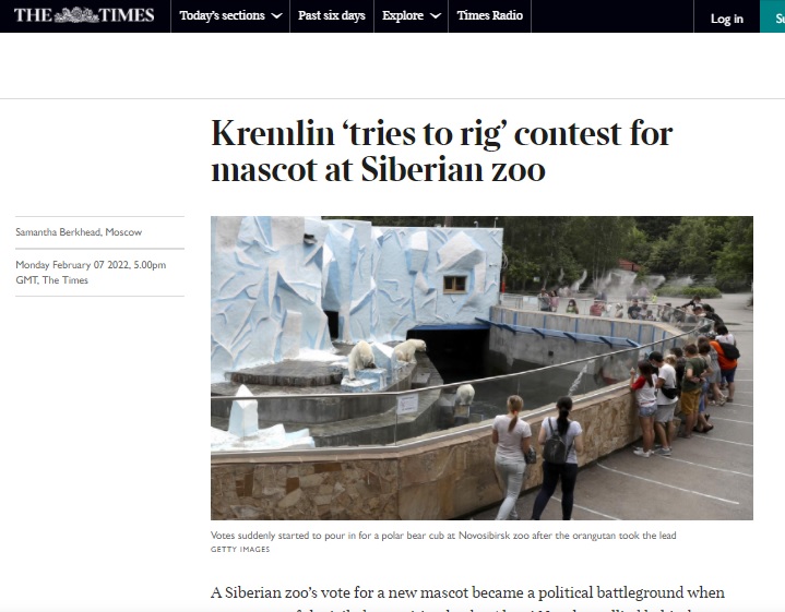 В The Times новость опубликована под заголовком "Кремль пытается сфальсифицировать конкурс на талисман в сибирском зоопарке". В материале указано, что голосование было отменено из-за активного участия оппозиции.