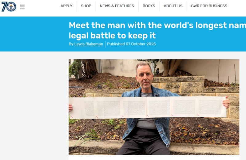 Обладатель самого длинного имени в мире, Лоуренс Уоткинс, был вынужден биться за него во время судебного разбирательства, чтобы официально закрепить за собой свой необычный рекорд. Его полное имя, состоящее из 2253 слов и занимающее около шести страниц, было признано Книгой рекордов Гиннесса, но путь к этому достижению оказался долгим и потребовал апелляции в высшую судебную инстанцию, сообщает официальный сайт Guinness World Records.