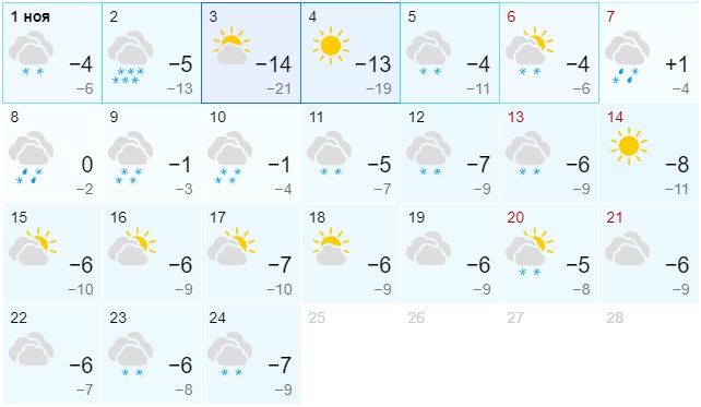 По данным сервиса "Яндекс.Погода", в первых числах ноября резуо похолодает, как и в конце октября будет идти снег. В среднем, температура ночью составит около -10 градусов, днём будет -7 градусов. Сервис обещает, что снег будет идти в ноябре почти каждый день.