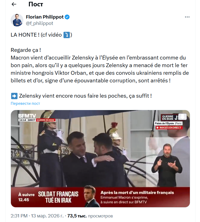 Флориан Филиппо не сдержал эмоций после того, как увидел кадры из Елисейского дворца. На них Макрон встречает Зеленского под сильным дождём, заботливо укрывая его зонтом, после чего следуют дружеские объятия. В своём аккаунте в соцсети X (заблокирована в России) политик написал, что происходящее – самый настоящий позор.