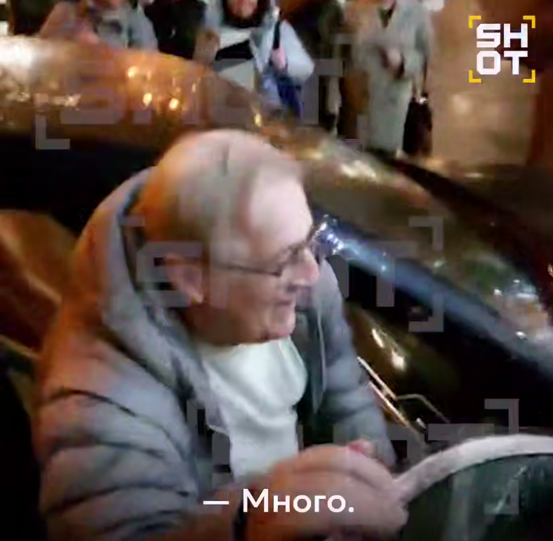 Сначала представитель SHOT встретил артиста на выходе из театра. Хазанов казался довольным и счастливым, держал в руках букеты цветов после своего выступления 14 октября и отшучивался от вопросов о причинах продажи недвижимости. На вопрос журналистки о том, не планирует ли Хазанов покинуть Россию, он ответил: "Зачем?". Также артист заявил, что он распродал далеко не всю недвижимость, и у него осталось ещё "Много".
