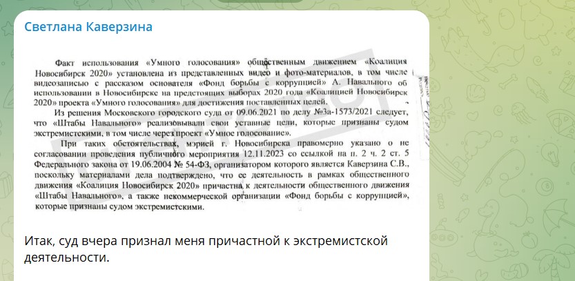 Суд в Новосибирске признал депутата горсовета Светлану Каверзину* причастной к экстремистской деятельности. Об этом политик сообщила в своём телеграм-канале.