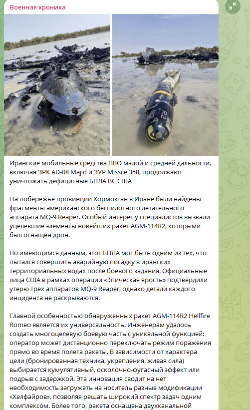 СМИ утверждают, что с начала нападения израильско-американских сил на Иран последний уже уничтожил как минимум три беспилотника MQ-9 Reaper (в США официально подтвердили данные о количестве, отказавшись отвечать на вопросы об обстоятельствах уничтожения дронов). Обломки одного из сбитых иранцами аппаратов нашли в провинции Хормозган.