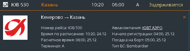 Судя по информации на сайте аэропорта, самолёт в Казань должен был вылететь ещё в 10:20, но время вылета перенесено на 6:00 25 декабря.