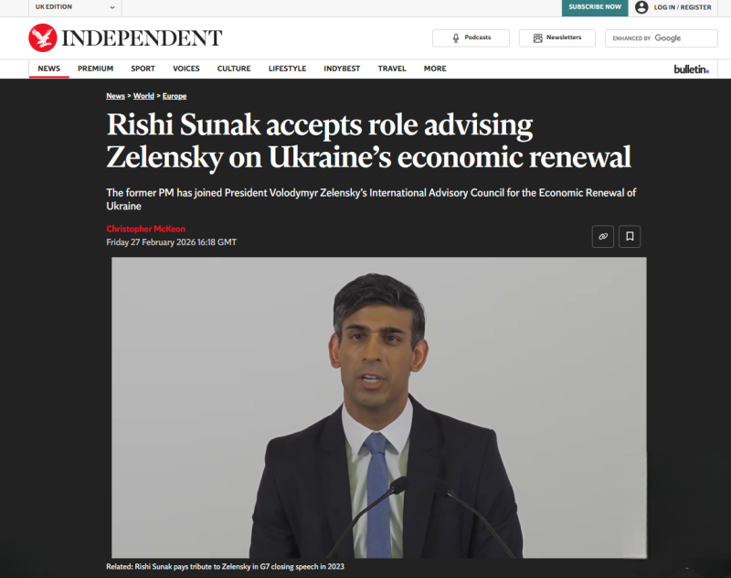 Бывший премьер-министр Великобритании Риши Сунак вошёл в команду советников главы киевского режима Владимира Зеленского. Экс-глава британского Кабмина будет на общественных началах помогать в восстановлении украинской экономики.