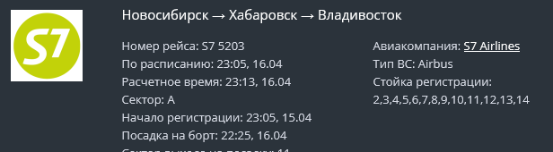 Из столицы Сибири рейс авиакомпании S7 вылетел в ночь на понедельник