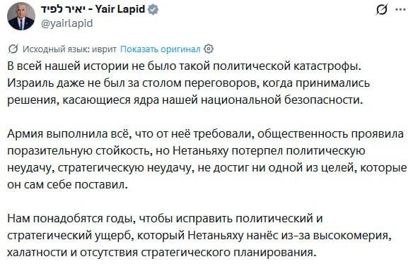 Лапид подчеркнул, что израильская армия выполнила все поставленные задачи, а общество проявило удивительную стойкость. Однако премьер-министр Биньямин Нетаньяху, по мнению оппозиционера, потерпел политическое и стратегическое поражение, не достигнув ни одной из целей, которые сам же и обозначил. Лапид написал: