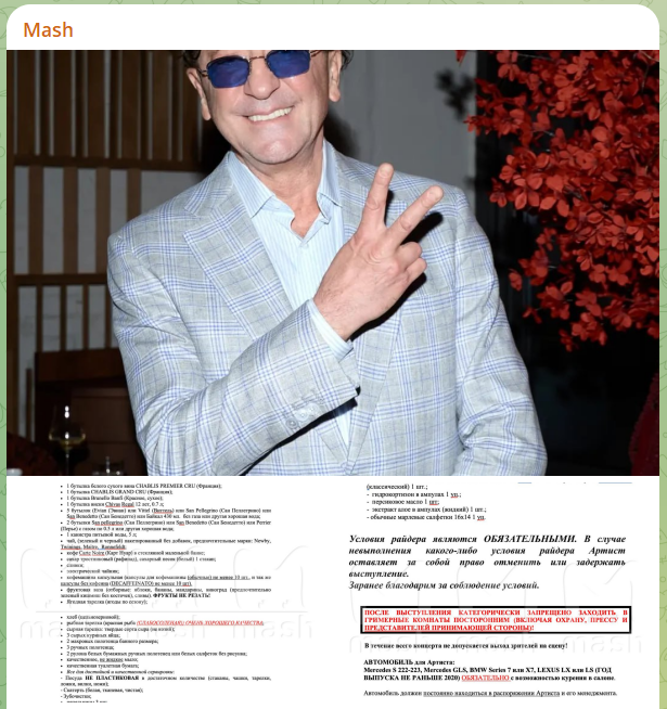 Григорий Лепс требует на свои выступления не менее четырёх литров элитного алкоголя. Об этом сообщает телеграм-канал Mash, публикуя райдер артиста.
