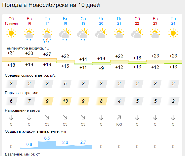 По данным сервиса "Гисметео" обещает, что небольшой дождь будет в Новосибирске уже во второй половине воскресенья, но температура всё равно будет держаться на уровне +31 градус.