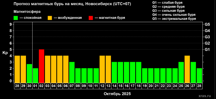 Согласно предварительному прогнозу магнитных бурь на октябрь 2025 года, 2 числа ожидается магнитная буря уровня G1 или силой 5 баллов. Потом до 6 октября магнитосфера будет возбуждённой.