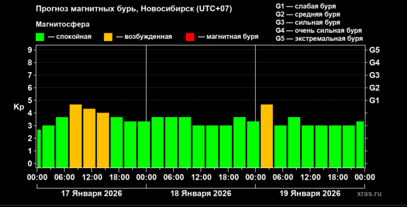 Магнитная буря достигла красного уровня вечером 16 января, но постепенно магнитосфера успокаивается. Согласно прогнозу магнитных бурь на предстоящие трое суток, вероятность ухудшения геомагнитной обстановки 17 января составляет 65%, 18 января - 56%, а 19 января - 31%.