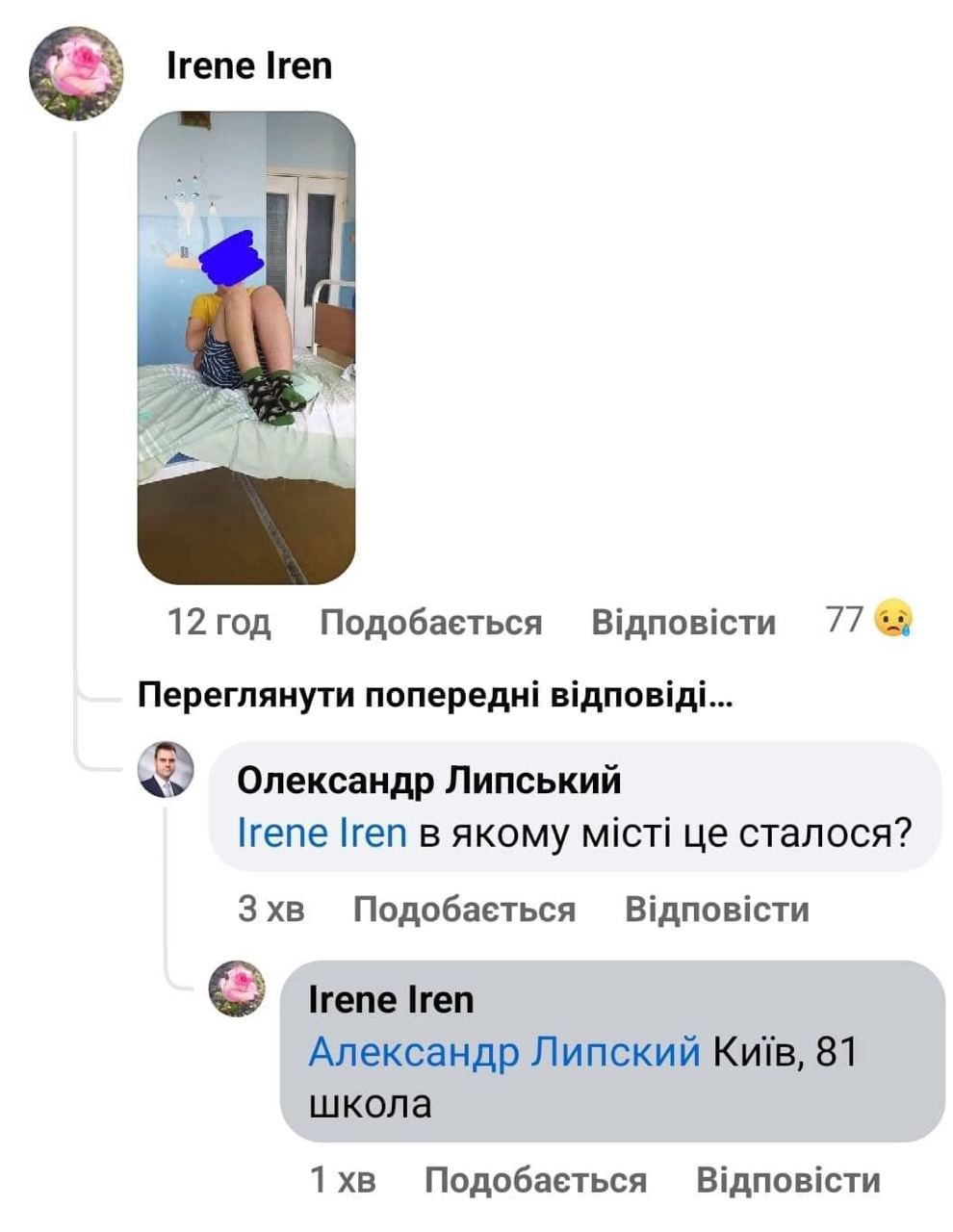 В киевской школе №81 на улице Павла Тычины агрессивно настроенные школьники набросились толпой на сверстника и били его за просмотренный мультик. Десять дней школьник скрывал тяжёлые травмы от семьи. Мать обнаружила случайно побои и теперь стремится добиться правосудия.