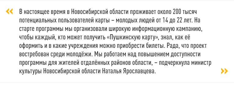Новосибирская область вошла в тройку лидеров среди регионов России по реализации федеральной программы "Пушкинская карта" среди молодёжи. Также картой активно пользуются молодые люди в возрасте от 14 до 22 лет в Москве и Санкт-Петербурге.