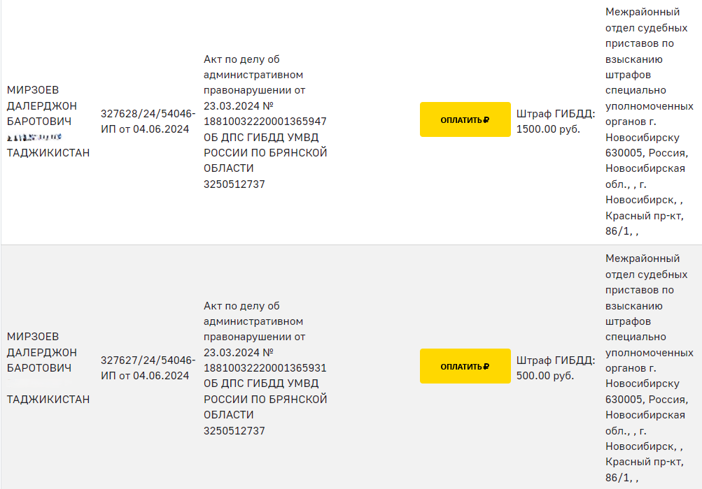 В базе данных Федеральной службы судебных приставов указано, что 22 марта иностранец дважды нарушил правила дорожного движения в Брянской области. Совокупный штраф, выписанный Мирзоеву, составляет две тысячи рублей.