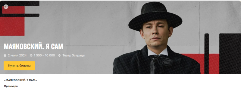 На сцене театра эстрады в Москве состоится премьера спектакля "Маяковский. Я сам" с Никитой Кологривым в главной роли. Спектакль поставлен по одноименной автобиографии поэта, которую дополнят его стихи и отрывки из поэм.