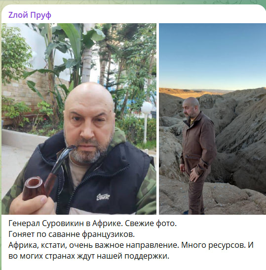 По информации телеграм-канала "Zлой Пруф", сейчас Суровикин "гоняет по саванне французиков".