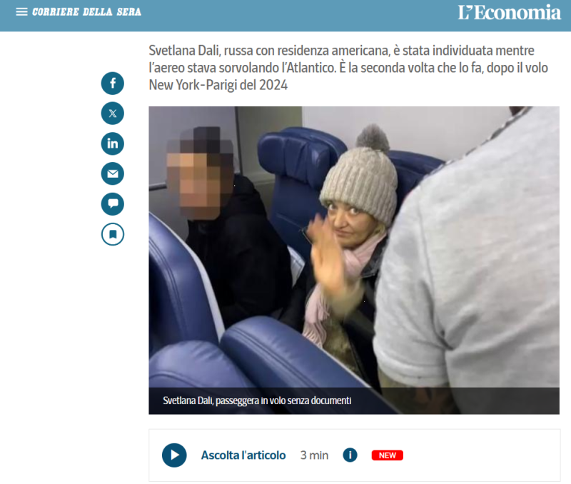 По предварительным данным, ей удалось миновать контроль безопасности и сотрудников на выходе на посадку, слившись с толпой пассажиров. Весь семичасовой перелёт через Атлантику женщина провела на свободном кресле, не привлекая к себе внимания. Экипаж обнаружил нарушительницу только перед самой посадкой в Италии, когда она делала вид, что не слышит вопросов о наличии билета.