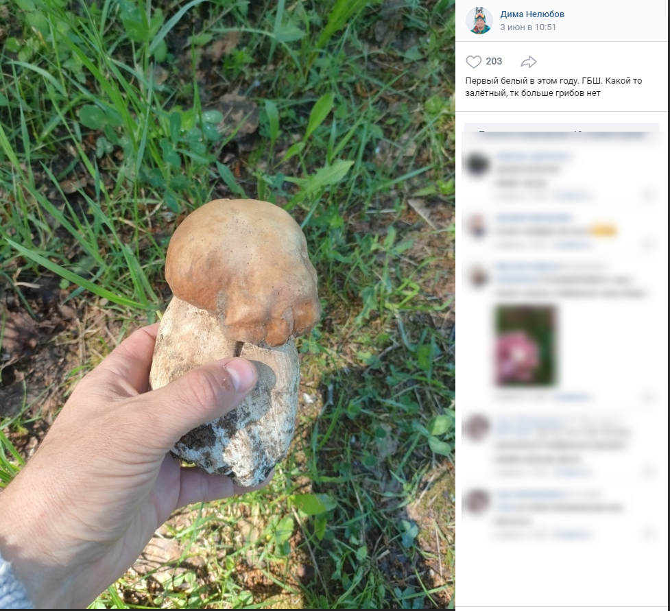 Мужчина уточнил, что гриб обнаружил 3 июня в лесном массиве у Гусинобродского шоссе, а также, что на поверку белый, несмотря на внешнюю плотность и крепость, оказался наполовину червивым.