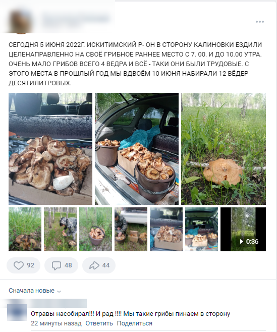 Другие грибники в группе хвастались, в основном, маслятами и подберёзовиками. Больше всего сообщений об удачных походах приходит из Мошковского района и окрестностей Новосибирска, в сторону Академгородка и Кольцова.