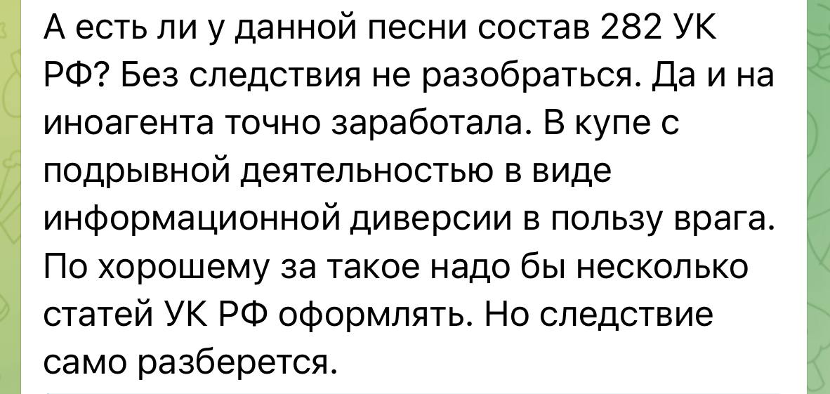 "А есть ли у этой песни состав 282 УК России? Без следствия не разобраться",  задаётся вопросом подписчики телеграм-канала "Многонационал".