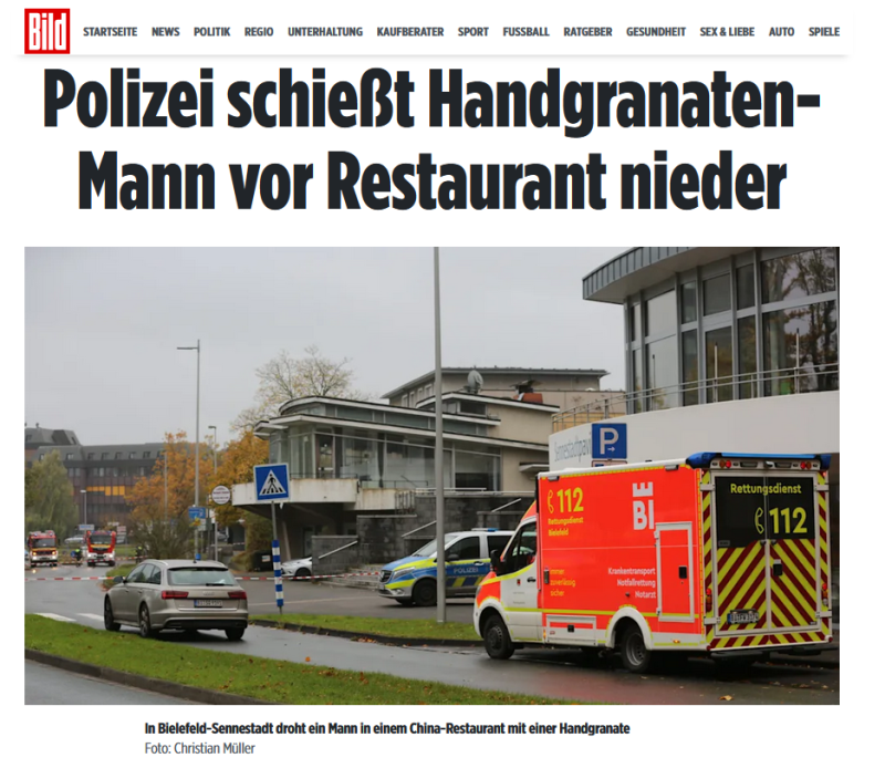 В немецком Билефельде полиция была вынуждена стрелять в мужчину, который устроил панику в китайском ресторане. По информации Bild, посетитель сначала спокойно сидел за столиком, просил алкоголь, а потом неожиданно показал то, что выглядело как ручная граната, и начал угрожать взрывом.