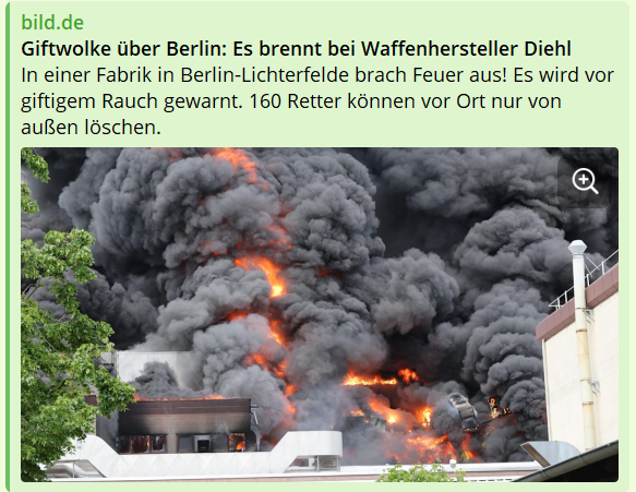 Берлинский завод Diehl Metall входит в состав немецкой группы Diehl – одного из крупнейших предприятий Военно-промышленного комплекса Германии. В огне уничтожен и офис "дочки" работающей над производством системы противовоздушной обороны IRIS-T. Оружие отправляют на Украину.