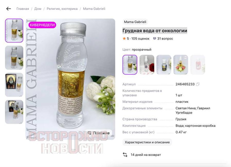В описании товаров утверждалось, что "грудная вода из чудотворного источника" способна помогать при онкологии. Параллельно предлагалась к покупке "земелька с места погребения преподобного Гавриила Ургебадзе" – известного православного святого из Грузии. Стоимость воды, которую, согласно инструкции, необходимо было разбавлять, достигала 900 рублей. Цена за небольшой образец земли составляла 300 рублей. Происхождение воды продавцы связывали с монастырём Самтавро. В отзывах некоторые пользователи выражали поддержку таким продажам и надежду на исцеление.