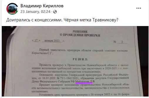 Он опубликовал часть документа, где написано, что проверка организована по инициативе депутата Госдумы Дениса Майданова, который обратился в правоохранительные органы. Решение о проведении проверки принято первым зампрокурором Новосибирской области Сергеем Коростылёвым 17 января 2022 года.