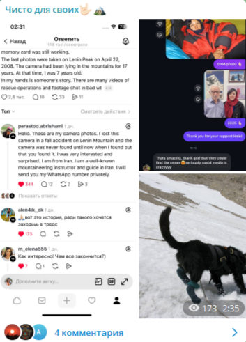 Парасту подтвердила, что действительно потеряла фотоаппарат ещё в 2008 году на вершине пика Ленина после падения. Увидеть свою старую технику вновь спустя столько лет ей показалось настоящим чудом.