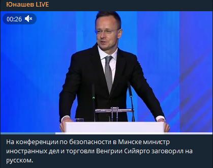 На конференции по безопасности в Минске министр иностранных дел и торговли Венгрии Сийярто заговорил на русском. Украинская мовная полиция бьется в истерике,