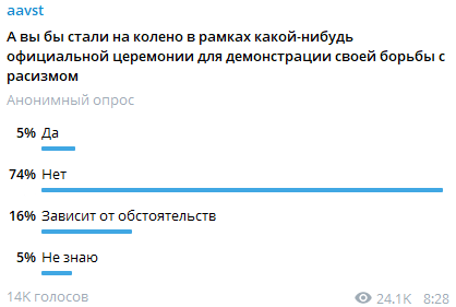 Согласно ответам подписчиков, 5% заявили, что согласились бы встать на колено. 16% корректировали бы свои действия, исходя из обстоятельств, 5% затруднились дать ответ на этот вопрос. При этом 74% заявили своё категорическое "нет" - на колени вставать они не готовы.