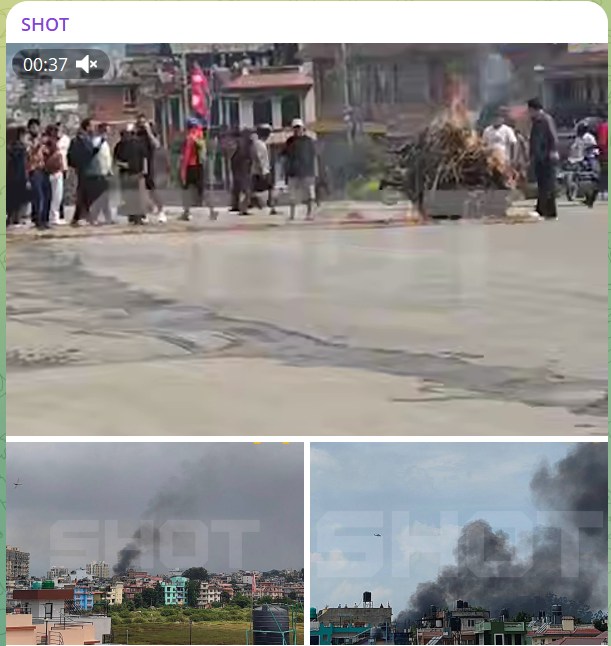 Протестующие выступают против существующего режима, поджигая дома чиновников и здания государственных учреждений. В небе летают военные вертолёты, которые пытаются подавить беспорядки. Премьер-министр Непала на фоне беспорядков подал в отставку.