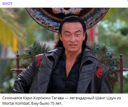 Скончался Кэри-Хироюки Тагава, американский актер японского происхождения. Его не стало 4 декабря 2025 года. Он умер в своем доме в Санта-Барбаре (Калифорния).