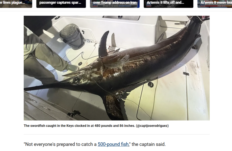 В прибрежных водах Флориды экипаж рыболовной яхты одержал победу над огромной меч-рыбой. Трофей потянул на 226 килограммов, а на то, чтобы затащить добычу на борт, у мужчин ушло больше пяти часов. Историей этого улова капитан судна поделился с журналистами Fox News.