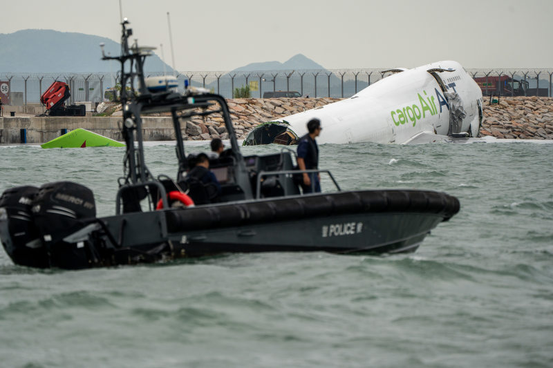 Прилетевший из Дубая грузовой Boeing 747 выкатился за пределы взлётно-посадочной полосы в аэропорту Гонконга. Самолёт частично оказался в море, а вместе с ним и автомобиль наземной службы, в котором находились двое рабочих – к сожалению, последние погибли.